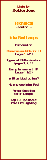 To start off with ..... this is actually nice and easy. There are a limited number of switchable colour cameras that can automatically (or manually) change over to Black and White (Monochrome) operation; as well as making the camera sensitive to Infra Red, it also significantly increases the cameras general sensitivity to light, so it will see better under visible illumination as well. Almost without exception, Black and White cameras are mostly sensitive to Infra Red, although some more so than others. In general terms, most cameras will produce very clear images under IR illumination at the 715nM (nano meter) range, although the illuminator will also be giving out a very bright red glow, which some may argue visibly increases the deterrent effect. The next filter setting available is 815nM, which apart from providing only a very dull red glow, does actually effectively reduce the amount of (camera visible) IR being produced. So for example, whilst most cameras may be about 60% sensitive at 715nM, they are only 30% receptive at 815nM; in other words, you'll need a lot more light energy output at the higher frequency to achieve the same result. 850nM (although very difficult to get hold of) is a very useful compromise lamp, as its light is effectively invisible to us mere humans, but most B/W cameras can still see it. | ||||||||||||||||||||||||||||||