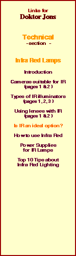 In a word, probably not; okay so thats two words, but there is an interesting paradox in the use of IR illuminators, particularly in commercial CCTV systems. For some applications, such as covert operations or zoological research, there is absolutely no alternative to using correctly applied IR illumination. However, when you look at the requirements for a standard commercial CCTV system, we hit a slight problem. From experience Doktor Jon could speculate that most private premises would benefit enormously from the presence of low level maintained lighting, simply for the comfort, convenience and security of those individuals passing by. Generally speaking, the installation costs for low level white lighting are higher than for a single high output IR illuminator; and yet the running costs may be significantly lower. Unfortunately, many CCTV installers regard IR lamps (particularly if sold in pairs) as a value added profit product, which is relatively easy to sell to the customer, and which is certainly going to require regular site visits to replace the burnt out bulbs; in other words a nice little earner! Would it surprise you to know that on many an occasion, Doktor Jon has actually seen an Infra Red lamp strapped below a weatherproof housing, containing a standard resolution colour camera. Whats wrong with that you may ask? Well, colour cameras are generally not sensitive to Infra Red, so when the bulb fails, the chances are there wont appear to be any change in the picture! In other words, a complete waste of money! Ideally, in locations that may be sensitive to light pollution such as where a commercial premises is neighbouring a residential housing estate (or a local astronomical observatory!), the use of IR would minimise any affects on adjacent properties, and still allow quality images to be acquired 24 hours a day. | ||||||||||||||||||||||||||||||