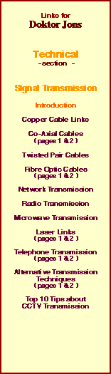 Having selected the very best CCTV equipment that money can buy, the next obvious consideration is how to move the picture signals around. Standard copper cables traditionally either co-axial (unbalanced) or to a much lesser degree twisted pair (balanced), provide a relatively inexpensive and user friendly transmission medium. Just recently, renewed interest has been shown in integrating Closed Circuit Television into existing building computer networks and indeed the Internet, although in relative terma its still very much in its infancy. Established high efficiency techniques such as fibre optic cable are already proven, albeit at a much higher cost than copper cable. Radio transmission has been around for an awfully long time, although unlike the much higher frequency Microwave link, it is unfortunately not legal for video use in the United Kingdom. Transmission using Telephone circuits and mobile (cellular) phones, each present new and affordable opportunities for relaying images, whilst specialist techniques such as short range Laser links and mains borne encrypted signals all have a specific role to play, in key situations. To find out more about the various transmission options, read on :- Copper Cable transmission - Unbalanced co-axial may well be a proven favourite, but what of balanced twisted pair as an alternative? | ||||||||||||||||||||||||||||||