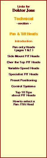Youve probably gathered by now, a P/T does exactly what the name says; it allows an operator to remotely command the camera to move up and down (Tilt), and left to right (Pan). As with camera housings, the P/T heads come in different sizes, and with various degrees of environmental protection, depending on where its intended to be used. So if you need to get a camera moving, here are the options:- Pan only heads - If you simply need to make a camera turn from side to side, a basic minipan unit may be all thats required. Over the Top (OTT) Pan and Tilt heads - A more recent innovation (only just!) is the P/T head that supports the camera from below. Specialist Pan and Tilt heads - The range is almost endless; medical, low noise, nuclear, high temperature, deep water, arctic .... Control systems for Pan and Tilt heads - What are the options for controlling a remote control platform? 10 must know things about PT heads - What only ten I hear you ask! Well the other 158 are just soooo boring, you really don't want to know. | ||||||||||||||||||||||||||||||
