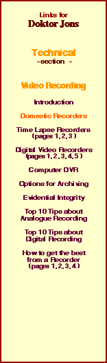You shouldnt use domestic video recorders for CCTV because theyre unreliable; thats no. 143 in the great myths of our time: and yet a number of basic surveillance systems, particularly in small retail outlets, use these cheap, almost disposable recorders for day to day operations. Is this a good thing?, well if the truth be told ... probably not. Industrial Time Lapse video recorders are built to endure constant operation 24/7, and the simple fact that they already have a built in Time and Date generator, obviously makes them far more suitable for the task in hand. That said, if a system has to be put togethor on a very tight budget, using a domestic VHS or DVD recorder to produce a visual record of events during opening hours, has to be better than no video at all. It perhaps goes without saying, but a seperate Time & Date unit can be added on to the domestic machine, but of course the combined cost will probably be about the same as a proper Analogue Time Lapse or basic DVR recorder. Whilst the overall picture quality of a domestic VHS or S-VHS is generally not disimilar from an industrial unit, you are limited to a maximum of eight hours recording in LP or Long Play format (PAL standard). Also the lack of alarm inputs, advanced picture search functions and external control options, would certainly prove limiting for all but the most basic of applications. There are of course the relatively recently introduced 'DVD' recorders, which can be very useful for capturing very high quality evidential recordings in 'real time'. Bottom line is, if the budget will stretch to a proper industrial analogue time lapse or digital DVR video, just keep the domestic machine for recording your favourite TV shows. | ||||||||||||||||||||||||||||||