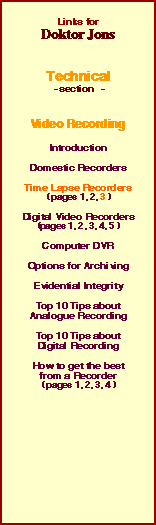 Use a good quality tape, treat the machine with absolute respect, and it should pay dividends in the long run. If VHS quality is inadequate you could always look at Super VHS. With all outward signs and functions being virtually identical to its less refined sibling, the difference in quality (and indeed cost) is quite marked. Whereas a really good VHS machine can only resolve a maximum of 250 lines, modern S-VHS recorders are rated up to 430 lines of resolution in colour. Again only the very best S-VHS tapes (SE-180) must be used, but the image quality will speak for itself. Apart from the different requirements for tape stock (incidentally S-VHS tapes can be used in standard VHS machines, but not the other way around), the overall functions of the machines are very similar. With variable settings for record speed, alarm inputs, time and date generation built in, a myriad of differant playback options (including still, and frame by frame inching using 'jog' & 'shuttle'), and picture search, the units are very much interchangeable. A very limited number of recorders will allow operation directly from a 12v DC battery source, which apart from field deployment and covert applications, also allows near effortless battery back up, for mission critical recordings (unfortunately, hardly any multiplexers offer this low voltage option, so manufacturers ..... perhaps you could please be persuaded to think more carefully about what your customers require from this equipment!). One almost totally useless feature of S-VHS machines, is a seperated Y/C video input, which allows the raw Black & White and Colour components of the video signal, to be pumped straight into the machine without additional (and signal degrading) processing associated with the normal composite (CVBS) input. Unfortunately, because these seperated Y/C signals wont travel much further than a snail with sunstroke, they are hardly if ever used for recording, although connection to a high resolution playback monitor located within a few metres, may offer some limited improvements in picture quality. Whatever the format, video cassettes are by modern standards, increasingly being regarded by some as bulky, and an irritation. Doktor Jon would have to say that given the choice for most applications, a well indexed, and correctly logged collection of cassette recordings, stored for at least fourteen days (30 days preferable), will fit the Bill most times. Remember that video tape does wear with use, in particular, oxide will shed more readily from the backing material in cheap cassettes. Use the tapes carefully and be sure to replace them at regular intervals. | ||||||||||||||||||||||||||||||